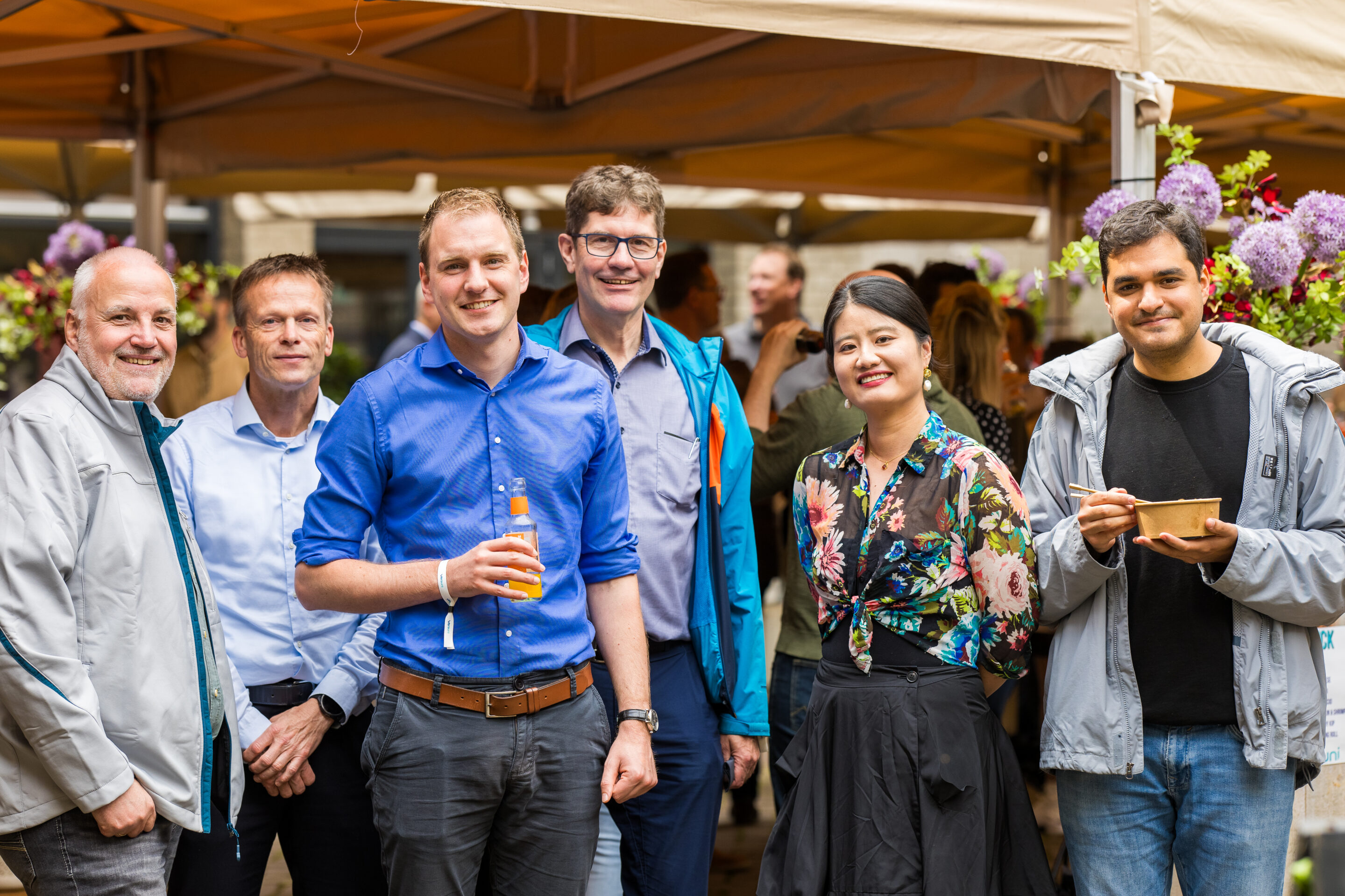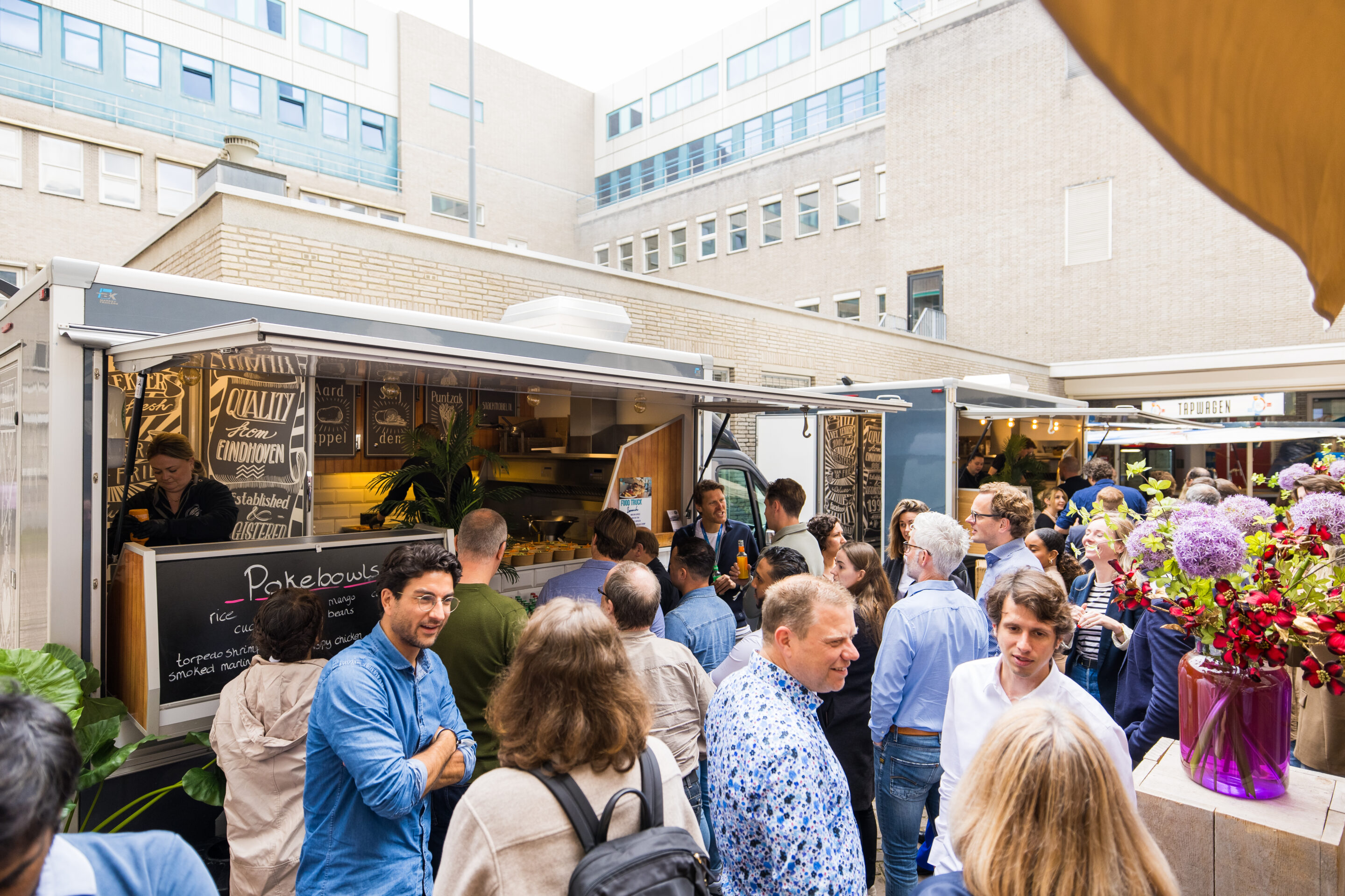 * Het binnencourt was helemaal aangekleed als een mini festival met in het midden houten bankjes, tent en bloemen met de kleuren van de huisstijl van Versuni. 2 foodtrucks voor kleine hapjes en lunch.